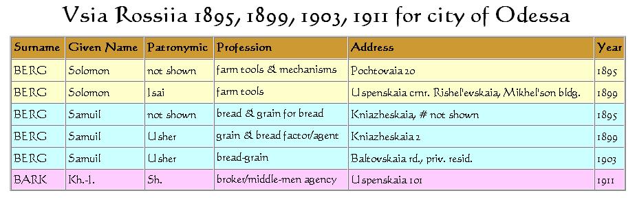 So, could I find proof of their father’s name by other means? Bobe Eva’s testimony that her maternal grandfather was a prominent merchant in Odessa dealing with agriculture led me search in one of the JewGen Databases, the Vsiia Rossiia, a business directory covering all the Russia Empire, for the city of Odessa in the years 1895, 1899, 1903, and 1911 – exactly the time period relevant to my search.